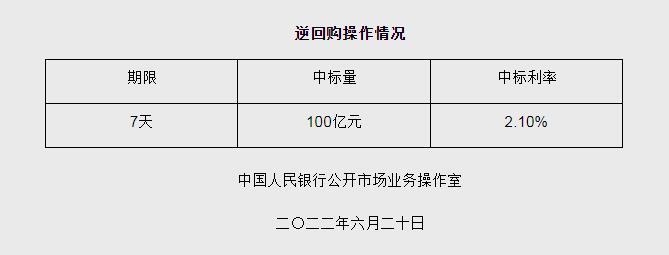 央行6月20日開展100億元逆回購操作 中標利率2.10%