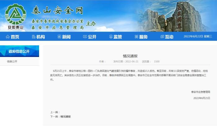 中新網(wǎng)6月22日電 據(jù)山東省泰安市應(yīng)急管理局網(wǎng)站消息,山東泰安市應(yīng)急管理局21日發(fā)布通報(bào),6月21日上午,泰安市綠地公館一層的一門頭房因液化氣罐泄漏引發(fā)的爆炸事故,共造成13人受傷。截至目前,共有3人因受傷嚴(yán)重、傷情惡化,經(jīng)搶救無效死亡。其余受傷人員正在接受進(jìn)一步治療。