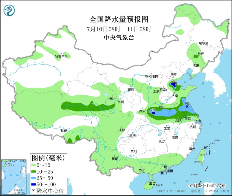 7月10日08時(shí)至11日08時(shí),青海南部、河北南部、黃淮西部、江淮大部等地部分地區(qū)有中到大雨,其中,河北中南部、河南西部、江蘇北部等地局地有暴雨(50~90毫米);南海南部海域有5~7級(jí)、陣風(fēng)8級(jí)的偏西風(fēng)。