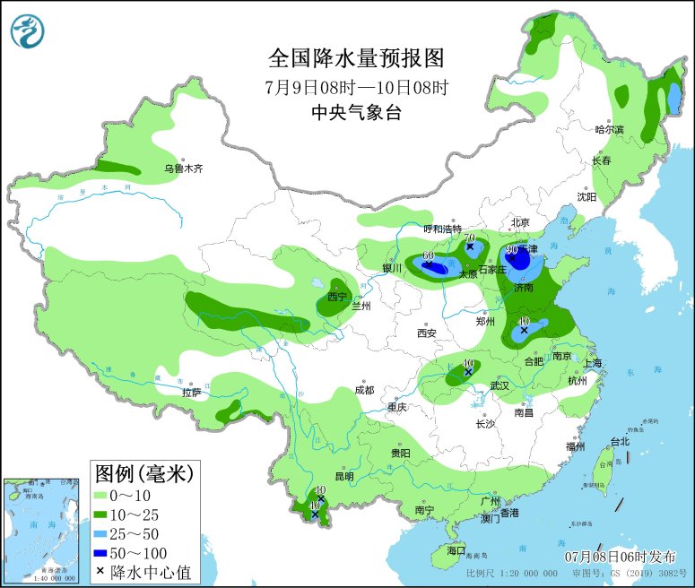 全國降水量預(yù)報(bào)圖(7月9日08時(shí)-10日08時(shí))