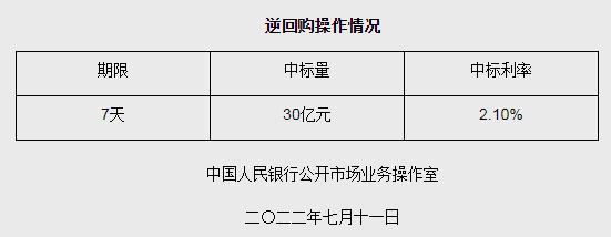 中新網(wǎng)7月11日電 據(jù)中國人民銀行網(wǎng)站消息,為維護銀行體系流動性合理充裕,2022年7月11日人民銀行以利率招標(biāo)方式開展了30億元逆回購操作,中標(biāo)利率2.10%。(中新財經(jīng))