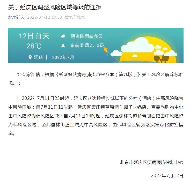 中新網(wǎng)7月12日電 據(jù)“北京延慶”微信公眾號(hào)消息,北京市延慶區(qū)疾病預(yù)防控制中心12日發(fā)布通報(bào)稱,經(jīng)專家評估,根據(jù)《新型冠狀病毒肺炎防控方案(第九版)》關(guān)于風(fēng)險(xiǎn)區(qū)解除標(biāo)準(zhǔn)規(guī)定:自2022年7月11日23時(shí)起,延慶區(qū)八達(dá)嶺鎮(zhèn)長城腳下的公社(酒店)由高風(fēng)險(xiǎn)降為中風(fēng)險(xiǎn)區(qū)域;自7月11日11時(shí)起,延慶區(qū)康莊鎮(zhèn)草原情羊蝎子火鍋店、百品尚購物中心由中風(fēng)險(xiǎn)降為低風(fēng)險(xiǎn)區(qū)域;自7月11日14時(shí)起,延慶區(qū)儒林街道長青削面館由中風(fēng)險(xiǎn)降為低風(fēng)險(xiǎn)區(qū)域,至此儒林街道全域無中高風(fēng)險(xiǎn)區(qū),由低風(fēng)險(xiǎn)區(qū)轉(zhuǎn)為落實(shí)常態(tài)化防控措施。