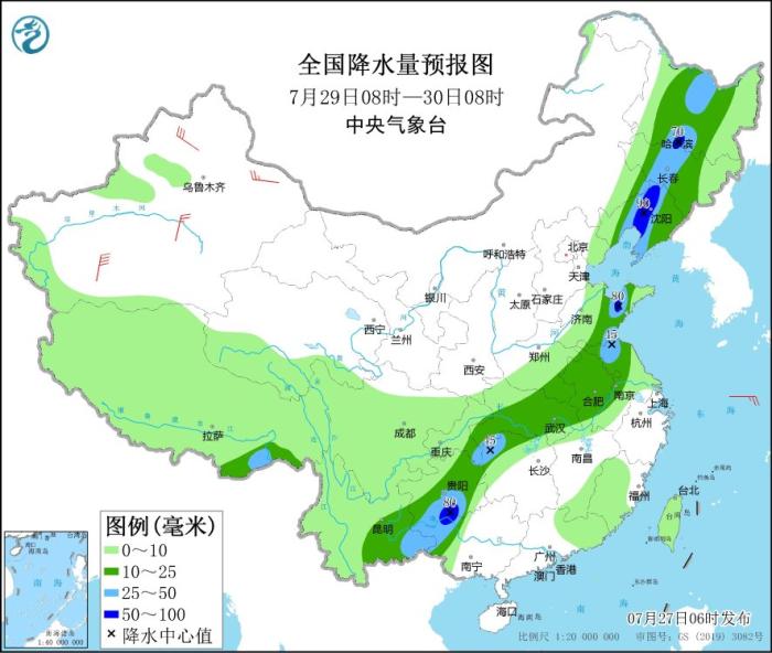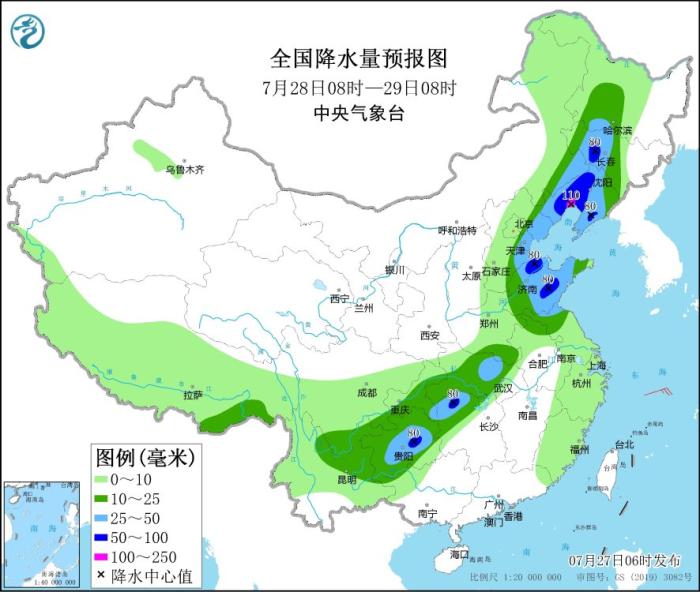7月28日08時(shí)至29日08時(shí),內(nèi)蒙古東南部、東北地區(qū)西部和南部、華北東部、黃淮東部、江漢大部、湖南北部和西部、西南地區(qū)東南部等地部分地區(qū)有中到大雨,其中,遼寧中西部、山東中部、湖南北部、貴州中部等地部分地區(qū)有暴雨,局地大暴雨(100~110毫米)(見(jiàn)圖3)。