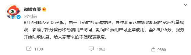 微博:2日晚自動(dòng)擴(kuò)容系統(tǒng)故障 致北京永豐等地機(jī)房寬帶容量超限