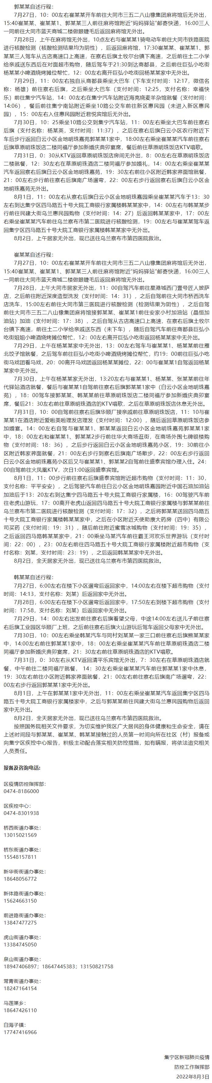 2022年8月2日,內(nèi)蒙古烏蘭察布市集寧區(qū)在居民“愿檢盡檢”中發(fā)現(xiàn)一管混檢異常樣本,隨即對(duì)所有混檢人員進(jìn)行單采單檢,其中大同市前來(lái)集寧區(qū)人員郭某某為初篩陽(yáng)性,同時(shí)對(duì)郭某某同行同住人員進(jìn)行核酸檢測(cè),同行同住人員崔某某、韓某某為初篩陽(yáng)性,目前此3例初篩陽(yáng)性人員均已轉(zhuǎn)運(yùn)至定點(diǎn)救治醫(yī)院,現(xiàn)將3人的行程軌跡公布如下: