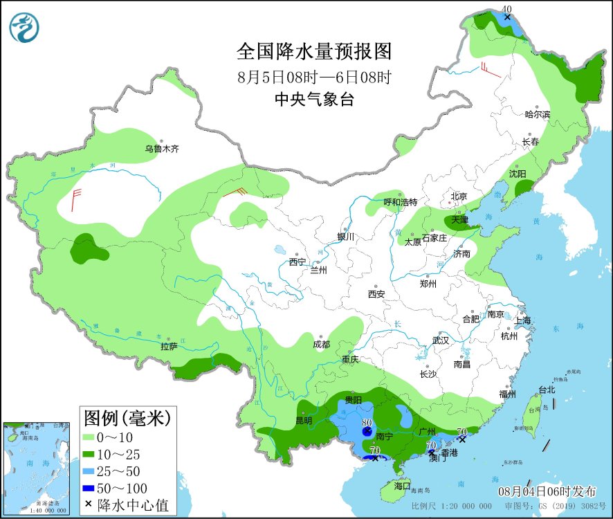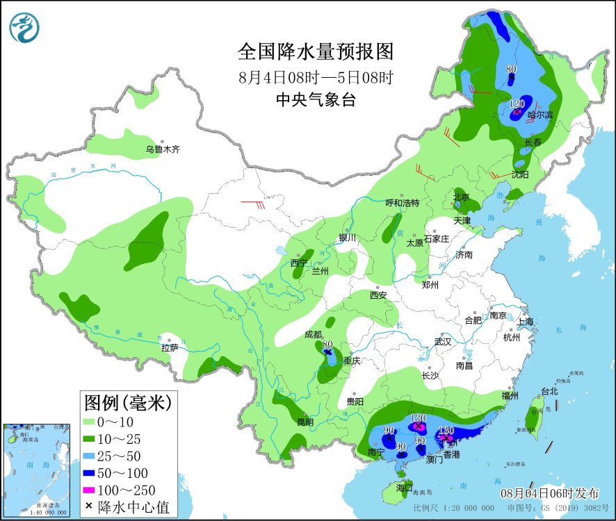 8月4日08時(shí)至5日08時(shí),內(nèi)蒙古東部、遼寧北部、吉林中西部、黑龍江中西部、北京東部、天津北部、福建東南部、廣東大部、廣西大部、四川盆地南部、云南北部和南部、青海東部等地有中到大雨,其中,吉林西部、黑龍江西部、廣東東南部和西部、廣西東部、四川盆地南部等地部分地區(qū)有暴雨,局地有大暴雨(100~130毫米)。甘肅西部、內(nèi)蒙古中東部等地部分地區(qū)有4~6級(jí)風(fēng)。