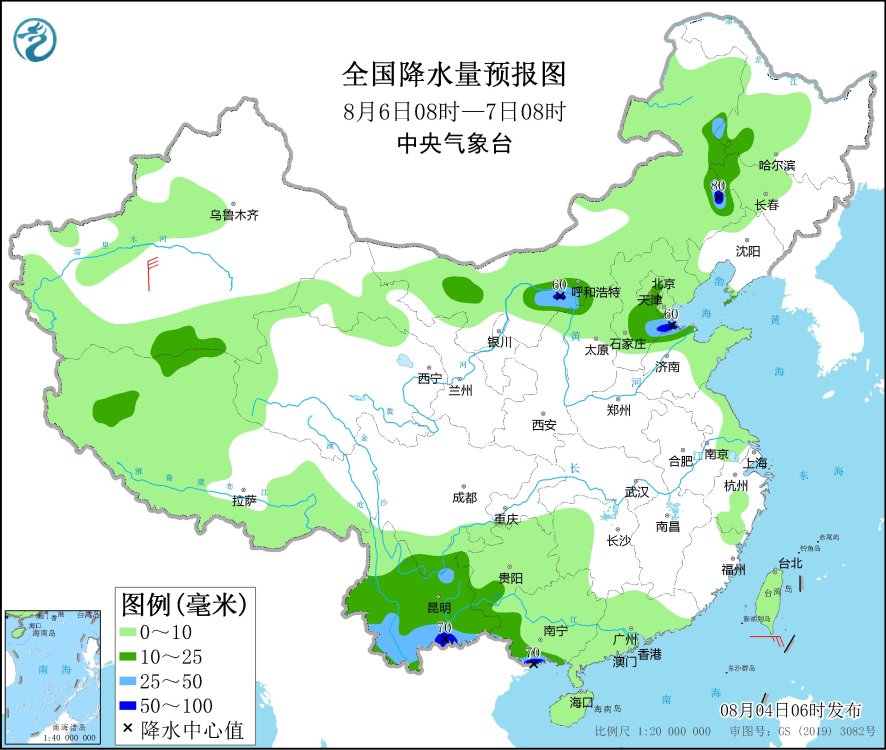 8月6日08時(shí)至7日08時(shí),陜西北部、內(nèi)蒙古河套地區(qū)和東北部、吉林西部、黑龍江西南部、北京東部、河北中部、天津南部、山東北部、廣西西南部、云南大部等地部分地區(qū)有中到大雨,其中,內(nèi)蒙古東南部、河北東部、山東北部、廣西西南部、云南南部等地局部地區(qū)有暴雨(50~80毫米)。新疆南疆盆地部分地區(qū)有5~6級(jí)風(fēng)。
