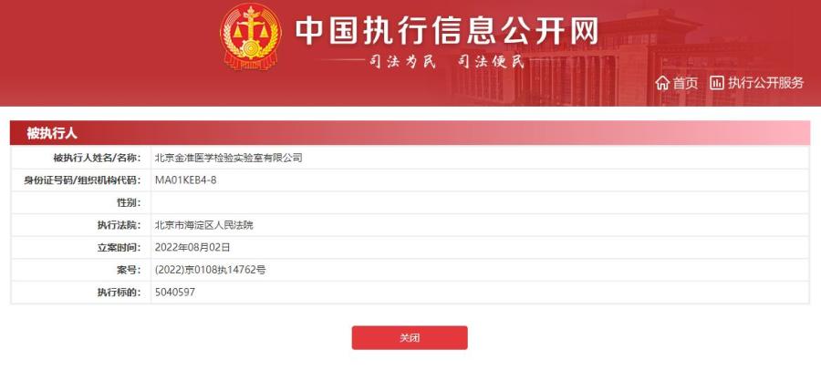 北京金準醫(yī)學實驗室成被執(zhí)行人 執(zhí)行標的504萬