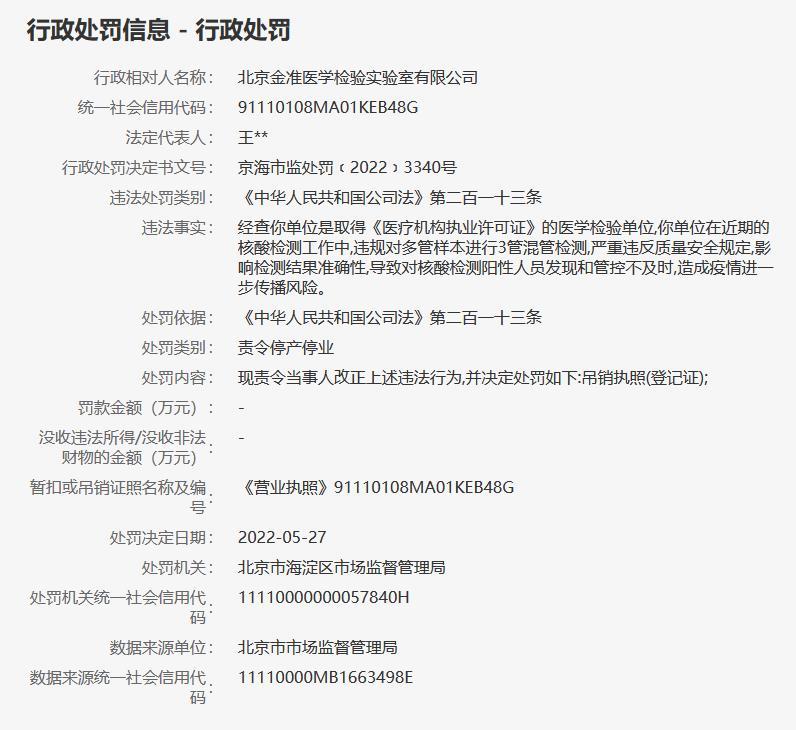 據(jù)信用中國(北京)網(wǎng)站5月31日行政處罰信息顯示,北京金準醫(yī)學檢驗實驗室有限公司在近期的核酸檢測工作中,違規(guī)對多管樣本進行3管混管檢測,嚴重違反質(zhì)量安全規(guī)定,影響檢測結(jié)果準確性,導致對核酸檢測陽性人員發(fā)現(xiàn)和管控不及時,造成疫情進一步傳播風險。北京市海淀區(qū)市場監(jiān)督管理局決定吊銷其執(zhí)照(登記證)。(中新財經(jīng))