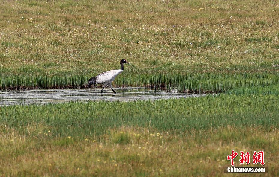 8月9日,祁連山南麓的青海省海北藏族自治州祁連縣央隆鄉(xiāng),三只黑頸鶴正在央隆濕地悠閑踱步,不時發(fā)出鳴叫聲。黑頸鶴是大型飛行涉禽,頸的上部為黑色,故稱黑頸鶴。每年,黑頸鶴在春季遷徙到繁殖地,秋季到達越冬地,是世界上唯一生長、繁殖在高原的鶴。圖為一只悠閑踱步的黑頸鶴。 賈天勇 攝