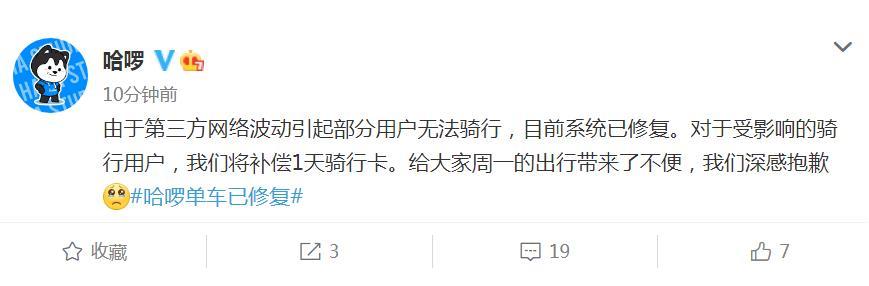 哈啰回應(yīng)單車崩了:系統(tǒng)已修復(fù) 補償1天騎行卡