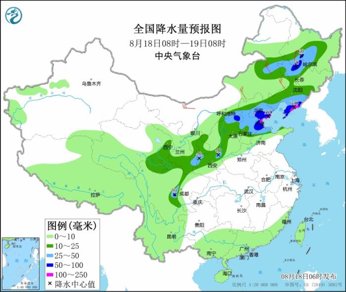8月18日08時至19日08時,內(nèi)蒙古中東部、黑龍江西南部、吉林西部、遼寧、青海南部、甘肅東部、寧夏、京津冀、山東北部、四川盆地西南部等地部分地區(qū)有中到大雨,其中,黑龍江西南部、吉林西部、遼寧東部和南部、山西北部、河北中北部、北京、天津等地部分地區(qū)有暴雨或大暴雨(100~180毫米)。內(nèi)蒙古中部和西北部、黑龍江西南部等地部分地區(qū)有4~6級風。渤海、黃海北部海域?qū)⒂?~5級、陣風6級增大到7~8級、陣風9級的偏南風。