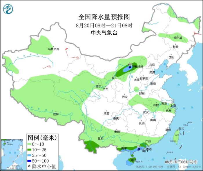 8月20日08時至21日08時,內(nèi)蒙古西部、云南西南部、華南南部和海南島等地部分地區(qū)有中到大雨,其中,內(nèi)蒙古河套地區(qū)、廣東西南部沿海等地部分地區(qū)有暴雨(50~90毫米)。新疆南疆盆地部分地區(qū)有4~6級風,其中,新疆東部部分地區(qū)有7~8級風。