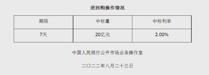 央行8月23日進行20億元7天期逆回購操作 中標利率2.00%