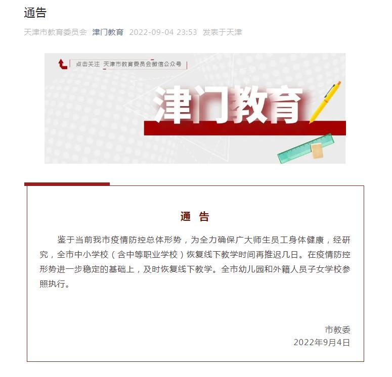 中新網(wǎng)9月5日電 天津市教育委員會4日晚在其官方微信發(fā)布通告稱,鑒于當前天津市疫情防控總體形勢,為全力確保廣大師生員工身體健康,經(jīng)研究,全市中小學校(含中等職業(yè)學校)恢復(fù)線下教學時間再推遲幾日。在疫情防控形勢進一步穩(wěn)定的基礎(chǔ)上,及時恢復(fù)線下教學。全市幼兒園和外籍人員子女學校參照執(zhí)行。