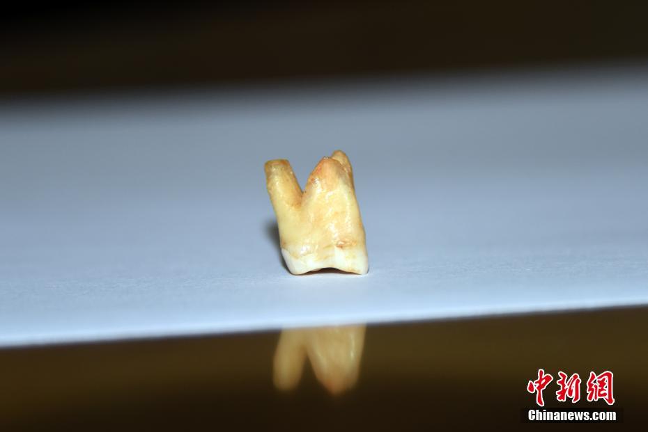 中國科學(xué)院古脊椎動物與古人類研究所(中科院古脊椎所)青年研究員吳妍帶領(lǐng)的研究團(tuán)隊(duì),通過對湖南道縣福巖洞遺址出土的、迄今所知東亞最早現(xiàn)代人(8-12萬年前)的牙齒化石進(jìn)行牙結(jié)石提取與分析,最新研究發(fā)現(xiàn)東亞最早現(xiàn)代人植物類食物的直接證據(jù),并發(fā)現(xiàn)當(dāng)時的古人類就已經(jīng)有了剔牙行為。這項(xiàng)重要研究發(fā)現(xiàn)的成果論文,已在國際專業(yè)學(xué)術(shù)期刊《植物科學(xué)前沿》發(fā)表。圖為9月7日,北京,中科院古脊椎所標(biāo)本館,展示一顆用于本次研究的湖南道縣福巖洞遺址出土、8-12萬年前東亞最早現(xiàn)代人牙齒化石標(biāo)本。 中新社記者 孫自法 攝