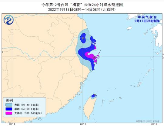 降水預(yù)報:9月13日8時至14日8時,臺灣島北部、浙江北部、上海、江蘇東南部等地將有大到暴雨,其中浙江東北部和上海等地的部分地區(qū)有大暴雨(100-140毫米)。