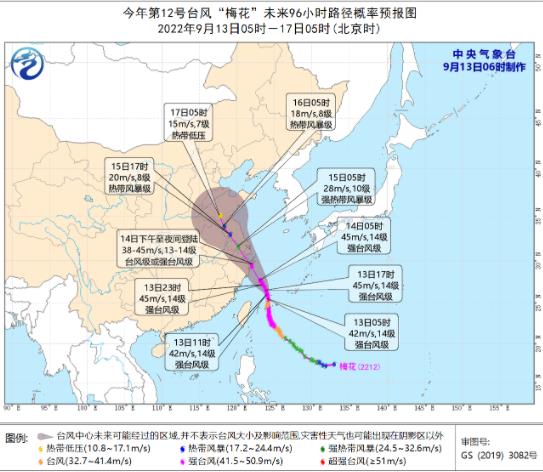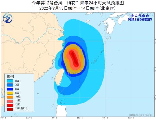 大風(fēng)預(yù)報:9月13日8時至14日8時,巴士海峽、臺灣海峽北部、臺灣以東洋面、黃海西南部海域、東海大部及釣魚島附近海域、長江口區(qū)、杭州灣以及臺灣島北部和東部沿海、浙江沿海、福建北部沿海、上海沿海、江蘇東南部沿海將有6-8級大風(fēng),陣風(fēng)9-11級,其中東海部分海域?qū)⒂?-11級大風(fēng),陣風(fēng)12-14級,“梅花”中心經(jīng)過的附近海面的風(fēng)力有12-14級,陣風(fēng)可達(dá)15-16級。
