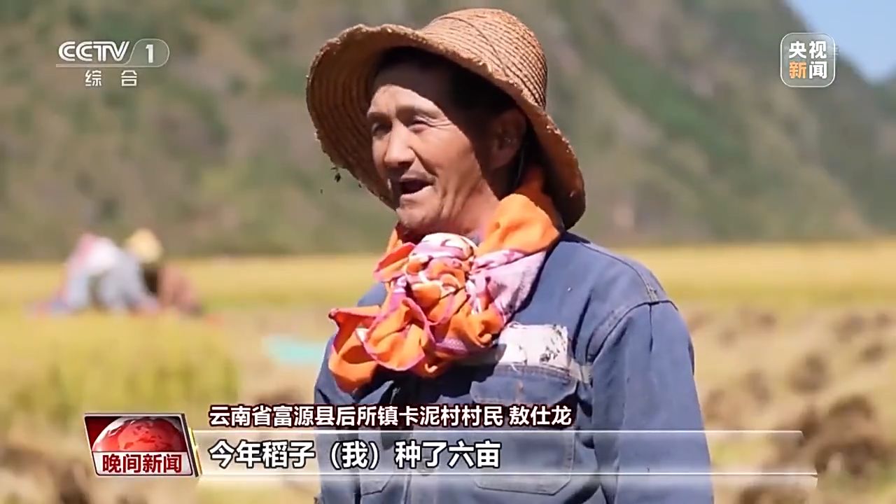 云南省富源縣后所鎮(zhèn)卡泥村村民 敖仕龍:今年稻子種了六畝,一畝收得到二十口袋,這個稻子比去年飽滿,比去年稱得出來(重),價格也比去往年好點。