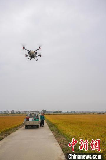 圖為南昌市安義縣農(nóng)戶使用無人機(jī)在稻田間進(jìn)行油菜籽播種。 記者 華山 攝