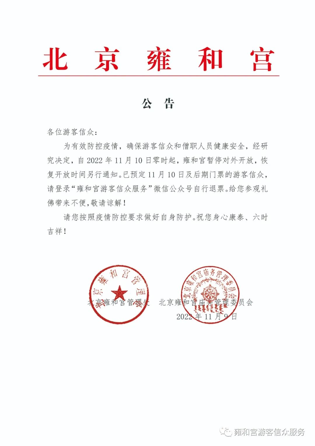 中新網11月9日電 據雍和宮游客信眾服務微信公眾號消息,為有效防控疫情,確保游客信眾和僧職人員健康安全,經研究決定,自2022年11月10日零時起,雍和宮暫停對外開放,恢復開放時間另行通知。已預定11月10日及后期門票的游客信眾,請登錄“雍和宮游客信眾服務”微信公眾號自行退票。