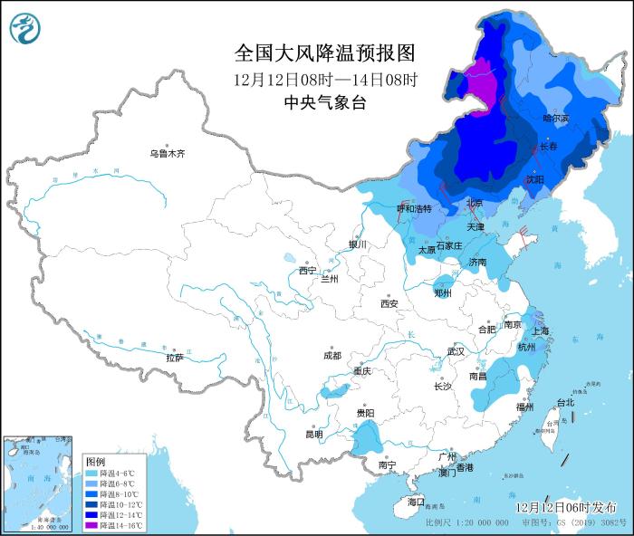 其中,12月12日08時至14日08時,內(nèi)蒙古中東部、東北地區(qū)大部、華北中北部、山東中部、河南北部、江南中東部等地氣溫將下降4~8℃,其中,內(nèi)蒙古東部、河北北部、遼寧西部、吉林西部等地部分地區(qū)降溫幅度可達(dá)10℃以上;上述部分地區(qū)并有4~6級偏北風(fēng),陣風(fēng)7~8級。中央氣象臺12月12日06時繼續(xù)發(fā)布大風(fēng)降溫預(yù)報(bào)。