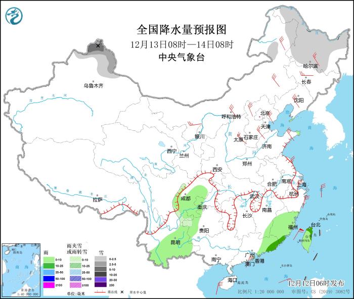 圖3 全國降水量預(yù)報(bào)圖(12月12日08時-13日08時)