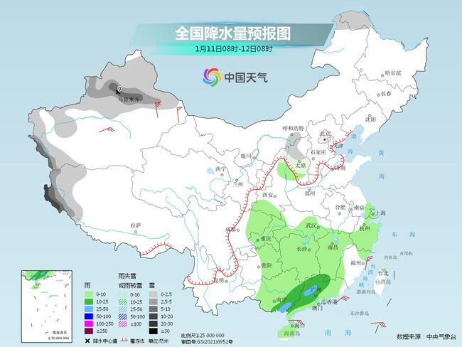 明天,隨著補(bǔ)充弱冷空氣南下,暖濕氣流增強(qiáng),我國(guó)中東部雨雪天氣將增多,其中黑龍江西北部、新疆北部和西部山區(qū)、西藏西部、陜西北部、山西中北部等地部分地區(qū)有小到中雪或雨夾雪,其中,新疆沿天山地區(qū)、西藏西部等地局地有大到暴雪。江漢南部、江南大部、西南地區(qū)東部、華南等地部分地區(qū)有小到中雨,局地有大雨。