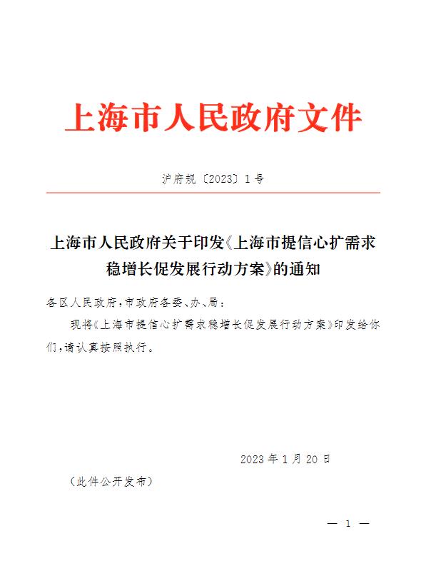 中新網(wǎng)1月29日電 據(jù)上海發(fā)布微信公眾號29日消息,為全面貫徹黨的二十大和中央經(jīng)濟工作會議精神,落實市第十二次黨代會和十二屆市委二次全會部署,抓牢高質(zhì)量發(fā)展首要任務(wù),大力提振市場預(yù)期和信心,推動經(jīng)濟社會發(fā)展開好局起好步,近期上海市制定了《上海市提信心擴需求穩(wěn)增長促發(fā)展行動方案》(以下簡稱《行動方案》)。