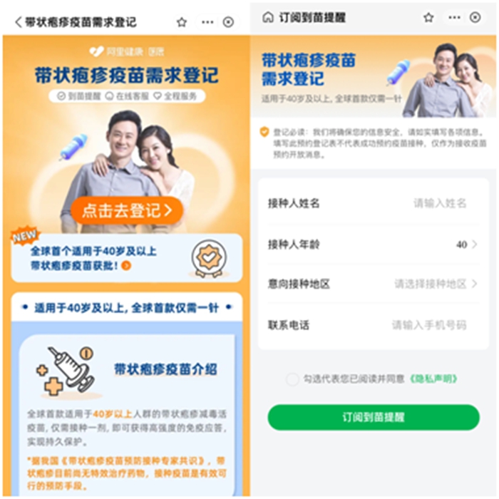 2日,阿里健康上線國(guó)產(chǎn)帶狀皰疹疫苗接種需求登記服務(wù),年齡40歲及以上、有接種需求的用戶可以在線填寫信息,訂閱到苗提醒。