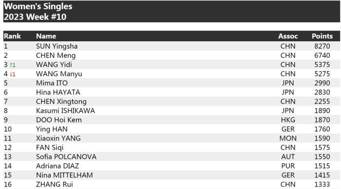女單方面,孫穎莎以8270分領(lǐng)先,穩(wěn)居第一,陳夢(mèng)6740分位居第二,王藝迪5375分位列第三,王曼昱排名第四。日本選手伊藤美誠(chéng)以2990分排在第五位。