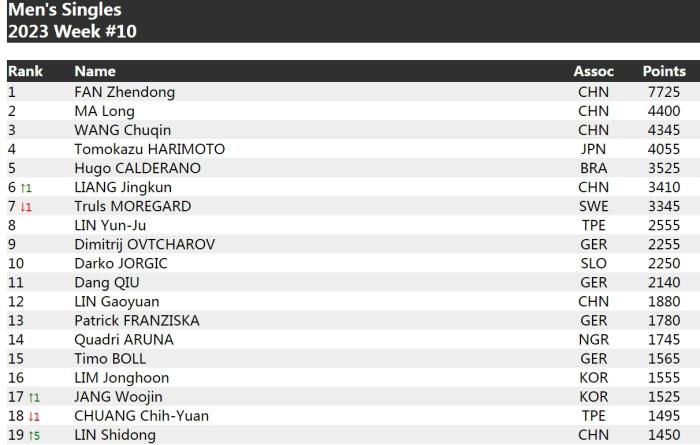 男單方面,樊振東繼續(xù)保持優(yōu)勢(shì),以7725分排名第一,馬龍以4400分位列第二,王楚欽以4345分排名第三,梁靖崑3410分排名第六,較第9周排名上升一位。