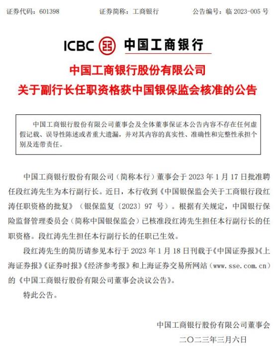 工商銀行6日發(fā)布公告稱,董事會于2023年1月17日批準聘任段紅濤為副行長。近日,工商銀行收到《中國銀保監(jiān)會關(guān)于工商銀行段紅濤任職資格的批復》。根據(jù)有關(guān)規(guī)定,中國銀保監(jiān)會已核準段紅濤擔任工商銀行副行長的任職資格。段紅濤先生擔任工商銀行副行長的任職已生效。