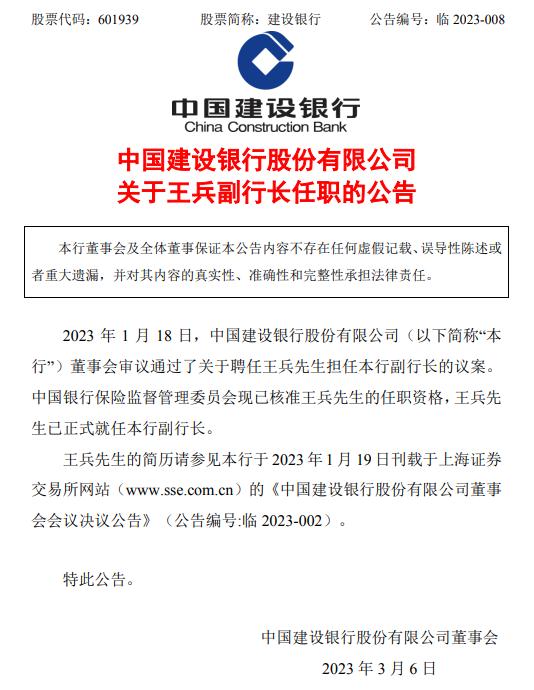 建設銀行6日發(fā)布的公告顯示,2023年1月18日,建設銀行董事會審議通過了關(guān)于聘任王兵擔任建設銀行副行長的議案。中國銀保監(jiān)會現(xiàn)已核準王兵的任職資格,王兵已正式就任建設銀行副行長。