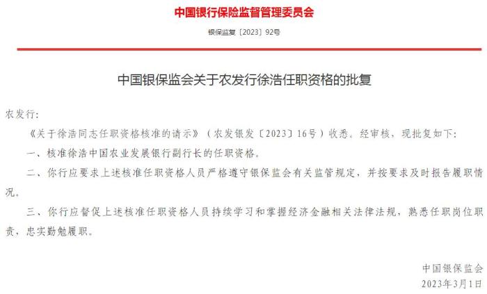 中國銀保監(jiān)會6日公布的《中國銀保監(jiān)會關(guān)于農(nóng)發(fā)行徐浩任職資格的批復》顯示,核準徐浩中國農(nóng)業(yè)發(fā)展銀行副行長的任職資格。(中新財經(jīng))