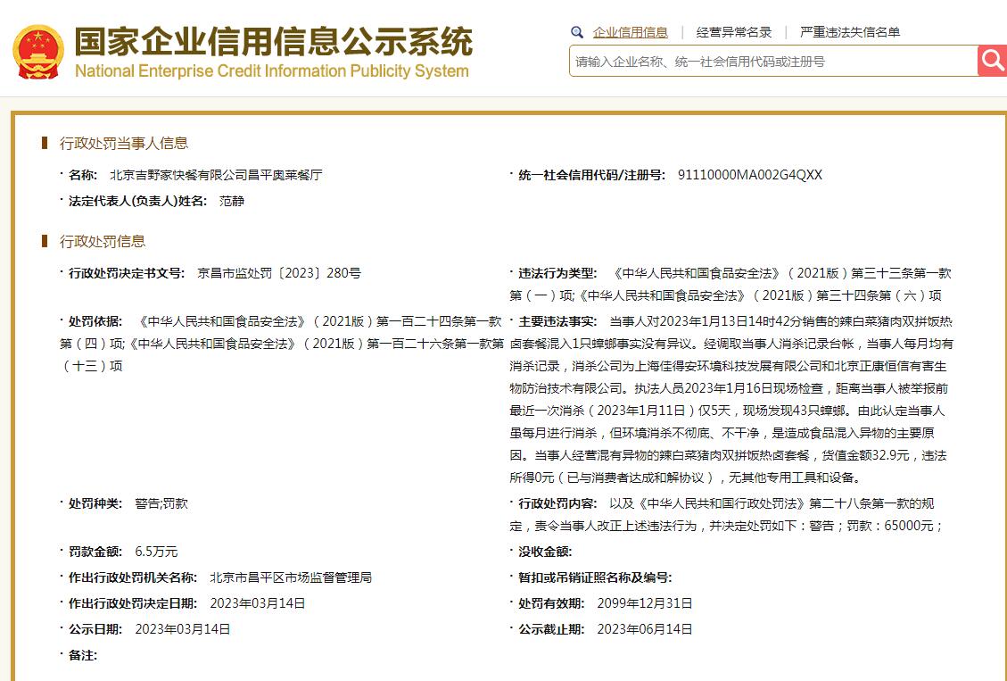 中新網(wǎng)3月15日電 國(guó)家企業(yè)信用信息公示系統(tǒng)網(wǎng)站顯示,近日,北京吉野家快餐有限公司昌平奧萊餐廳因違反食品安全法,被北京市昌平區(qū)市場(chǎng)監(jiān)督管理局罰款6.5萬(wàn)元。