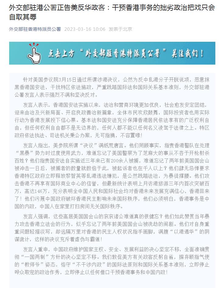 中新網(wǎng)3月16日電 據(jù)外交部駐港公署微信公眾號消息,針對美國參議院3月15日通過所謂涉港決議,公然為反中亂港分子開脫說項,惡意抹黑香港國安法,干擾特區(qū)依法施政,嚴(yán)重踐踏國際法和國際關(guān)系基本準(zhǔn)則,外交部駐港公署發(fā)言人表示強(qiáng)烈不滿和堅決反對。
