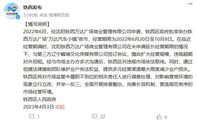 中新網(wǎng)4月3日電 鐵西發(fā)布官方微博3日發(fā)布情況說明:2022年6月,經(jīng)沈陽鐵西萬達廣場商業(yè)管理有限公司申請,鐵西區(qū)政府批準舉辦鐵西萬達廣場“萬達汽車小鎮(zhèn)”夜市,經(jīng)營期限為2022年6月20日至10月8日。在臨近經(jīng)營期滿時,沈陽鐵西萬達廣場商業(yè)管理有限公司在未申請延長經(jīng)營期限的情況下,與第三方遼寧峰瑞文化傳媒有限公司簽訂協(xié)議,擅自擴大經(jīng)營規(guī)模,違規(guī)超期對外招租。