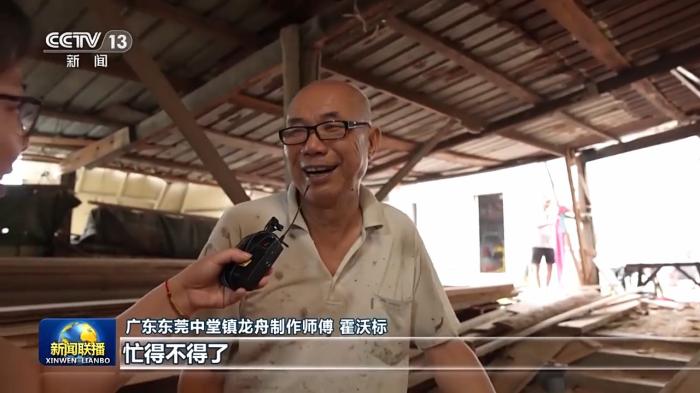 廣東東莞中堂鎮(zhèn)龍舟制作師傅霍沃標:忙得不得了,真的忙得不得了。今年龍舟(賽)特別特別多。我訂單都不敢接了。