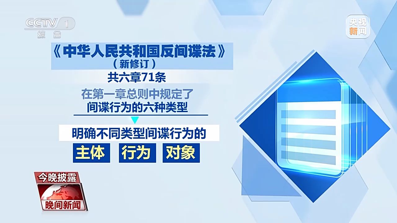國(guó)家安全是安邦定國(guó)的重要基石。近年來(lái),我國(guó)面臨的安全威脅日趨多元,反間諜斗爭(zhēng)形勢(shì)也更加嚴(yán)峻復(fù)雜。從本月起,新修訂的《反間諜法》開始施行。新法對(duì)間諜行為,做出進(jìn)一步充實(shí)和細(xì)化。那么按照新法,哪些行為將被認(rèn)定為間諜行為?作為普通群眾,一旦發(fā)現(xiàn)間諜行為,又該如何處理呢?今晚披露,一塊來(lái)關(guān)注。