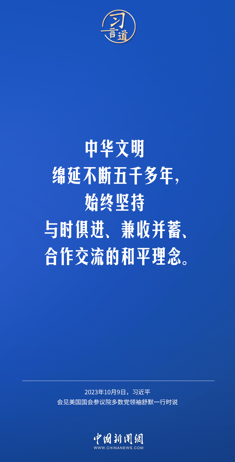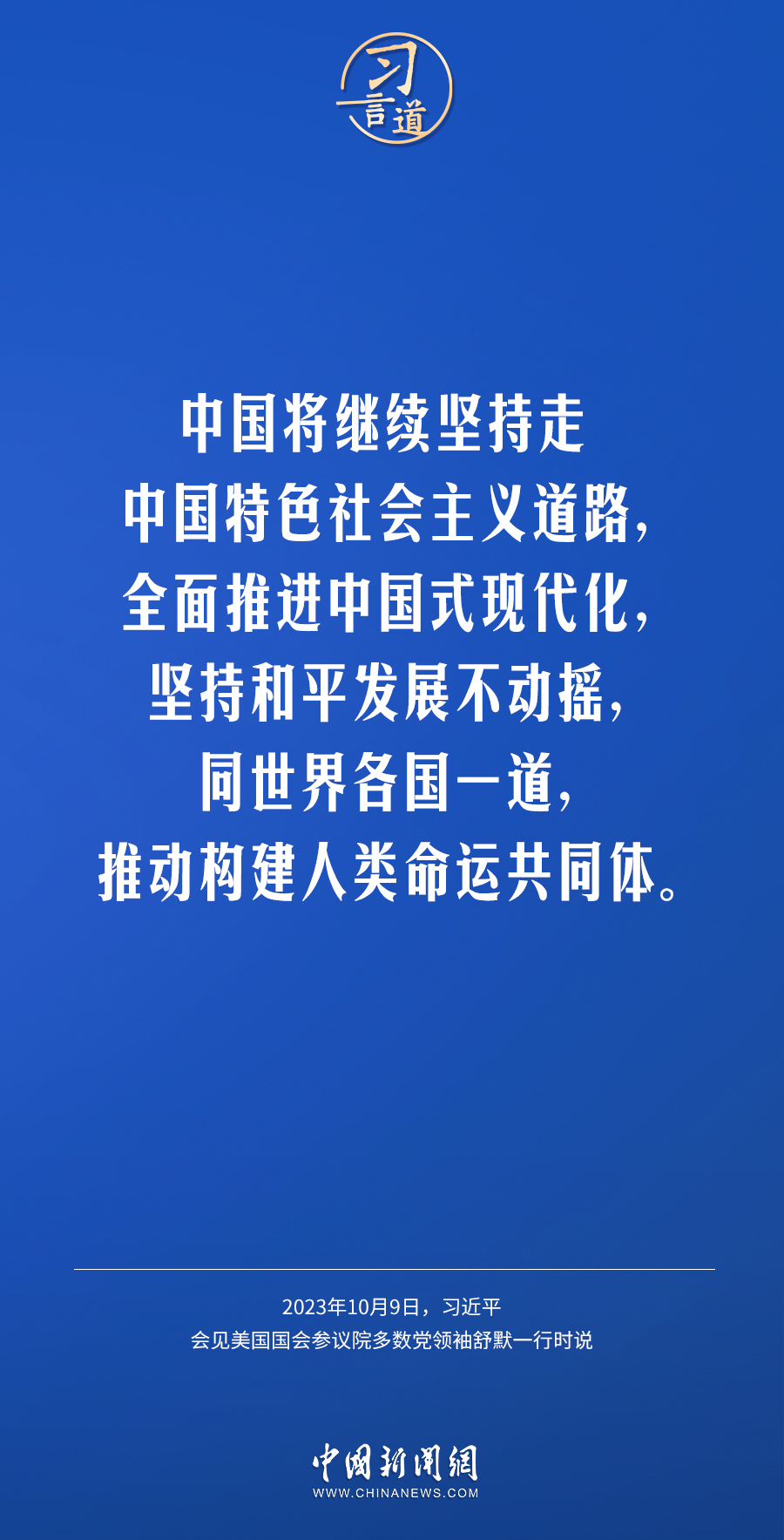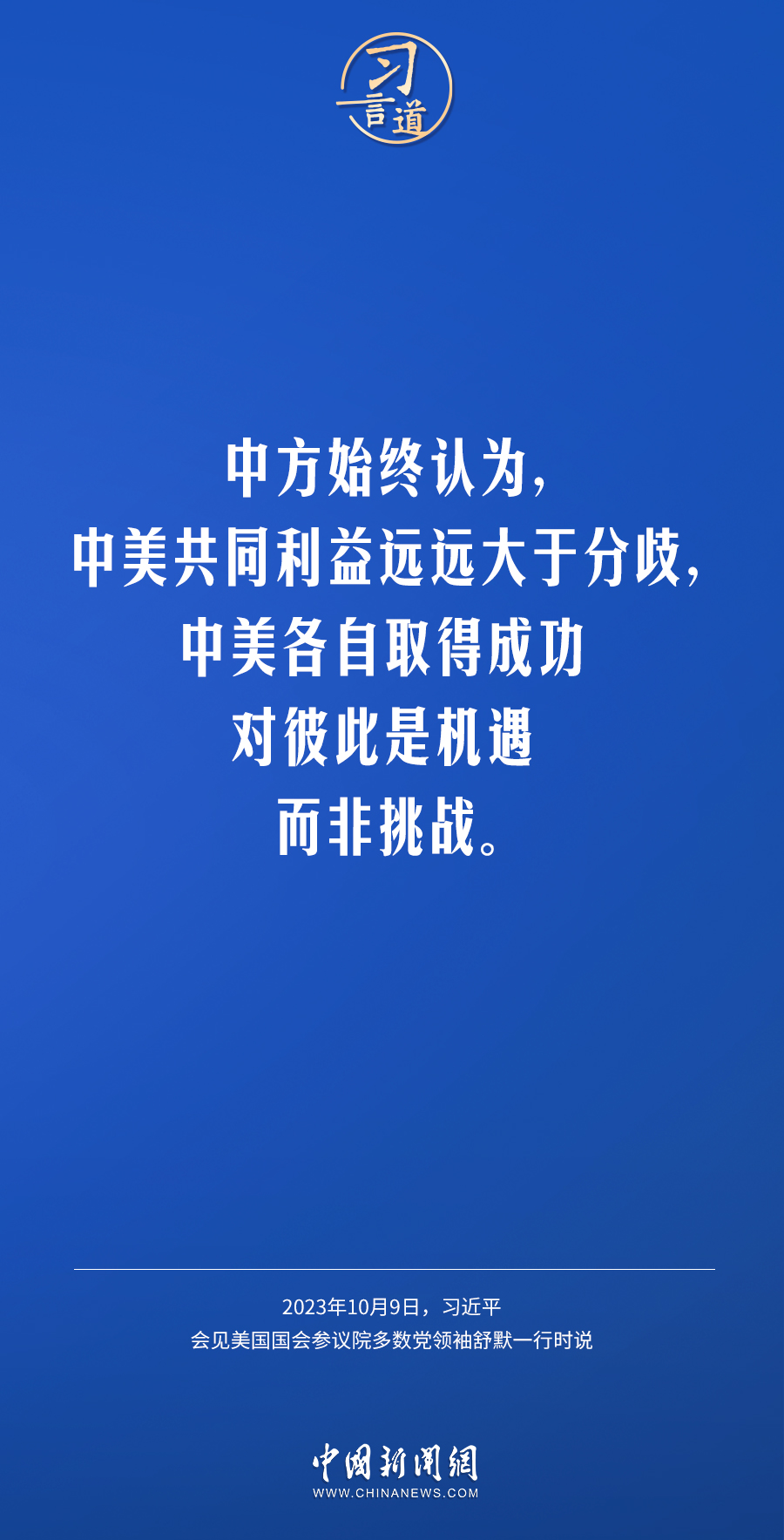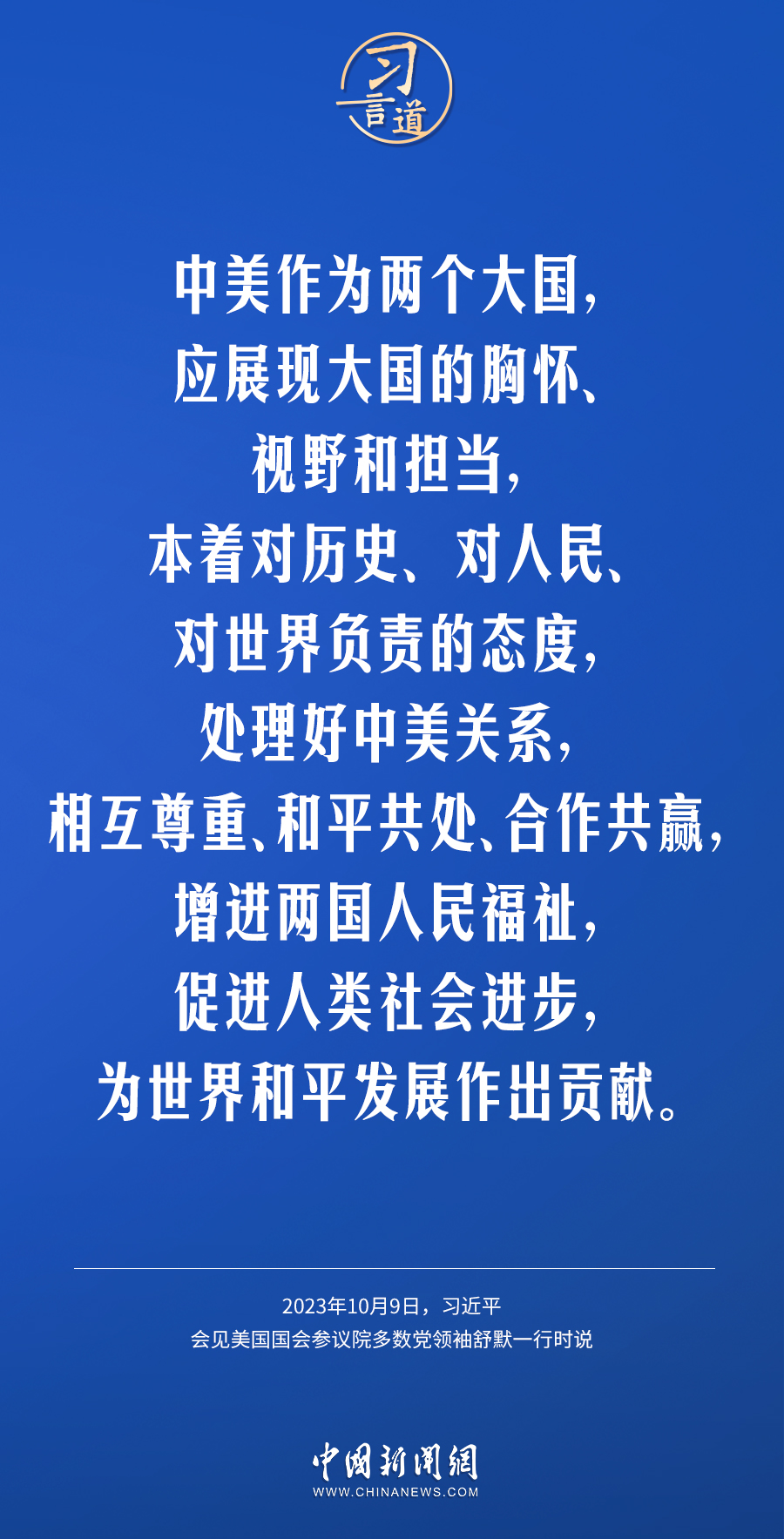 10月9日下午,國(guó)家主席習(xí)近平在人民大會(huì)堂會(huì)見美國(guó)國(guó)會(huì)參議院多數(shù)黨領(lǐng)袖舒默率領(lǐng)的美國(guó)國(guó)會(huì)參議院兩黨代表團(tuán)。習(xí)近平指出——