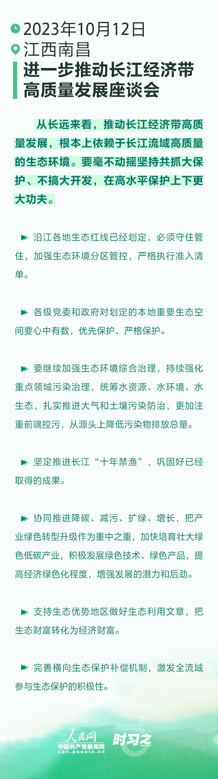 10月12日下午,習(xí)近平總書記在江西省南昌市主持召開進(jìn)一步推動(dòng)長(zhǎng)江經(jīng)濟(jì)帶高質(zhì)量發(fā)展座談會(huì)并發(fā)表重要講話。座談會(huì)上,總書記指出,從長(zhǎng)遠(yuǎn)來看,推動(dòng)長(zhǎng)江經(jīng)濟(jì)帶高質(zhì)量發(fā)展,根本上依賴于長(zhǎng)江流域高質(zhì)量的生態(tài)環(huán)境。