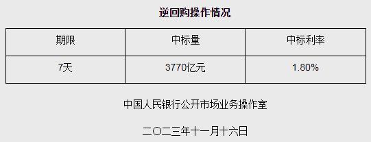 中新網(wǎng)11月16日電 據(jù)央行網(wǎng)站消息,為維護(hù)銀行體系流動(dòng)性合理充裕,2023年11月16日人民銀行以利率招標(biāo)方式開展了3770億元逆回購操作,中標(biāo)利率1.80%,期限為7天。具體情況如下: