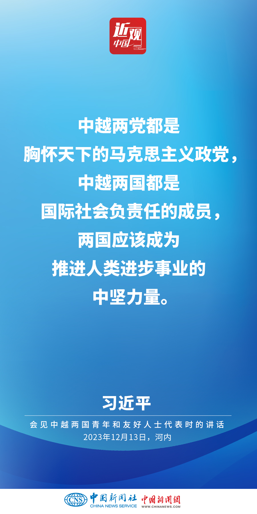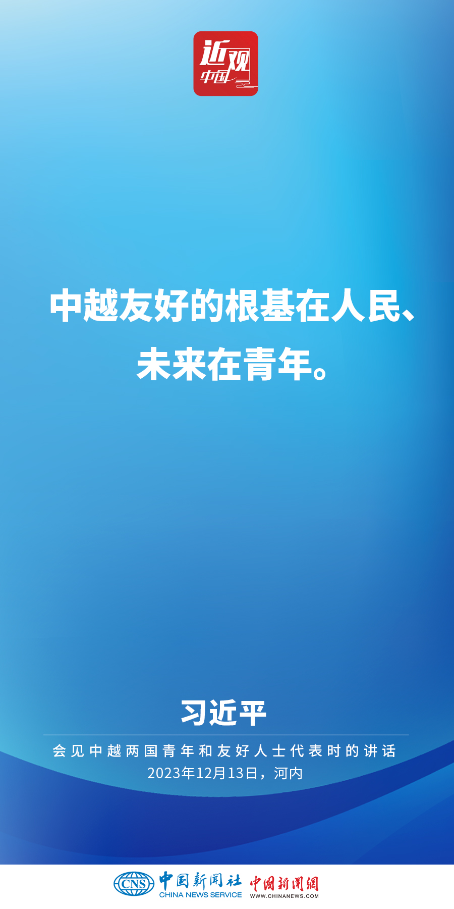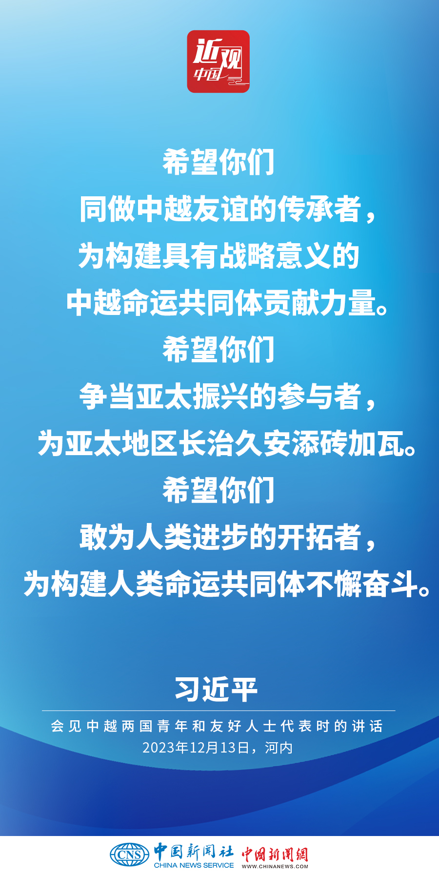當?shù)貢r間12月13日下午,中共中央總書記、國家主席習近平和夫人彭麗媛在河內(nèi)同越共中央總書記阮富仲夫婦共同會見中越兩國青年和友好人士代表。他在題為《賡續(xù)傳統(tǒng)友誼,開創(chuàng)中越命運共同體建設(shè)新征程》的重要講話中指出,展望未來,我們要始終不忘初心,牢記使命,攜手走好各自社會主義道路,讓工業(yè)化現(xiàn)代化建設(shè)成果更多惠及兩國人民,共同為人類進步事業(yè)作出更大貢獻。