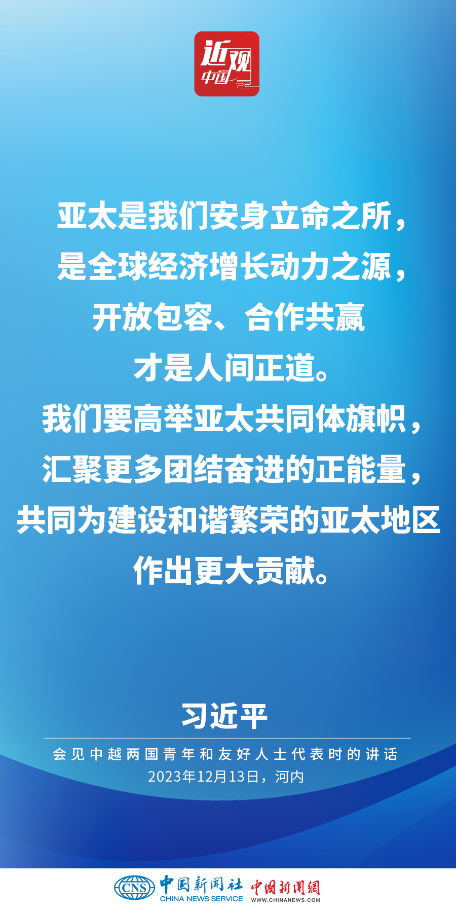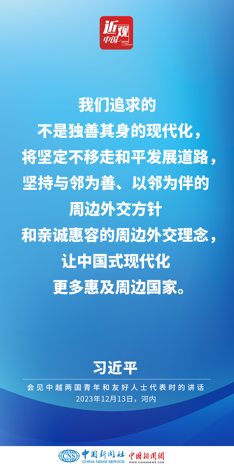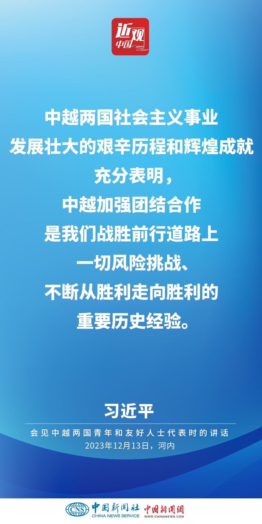 當?shù)貢r間12月13日下午,中共中央總書記、國家主席習近平和夫人彭麗媛在河內(nèi)同越共中央總書記阮富仲夫婦共同會見中越兩國青年和友好人士代表。他在題為《賡續(xù)傳統(tǒng)友誼,開創(chuàng)中越命運共同體建設(shè)新征程》的重要講話中指出,展望未來,我們要始終不忘初心,牢記使命,攜手走好各自社會主義道路,讓工業(yè)化現(xiàn)代化建設(shè)成果更多惠及兩國人民,共同為人類進步事業(yè)作出更大貢獻。