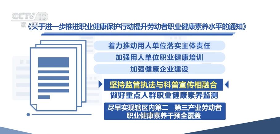 《通知》指出,著力推動用人單位落實主體責任,加強用人單位職業(yè)健康培訓,加強健康企業(yè)建設。堅持監(jiān)管執(zhí)法與科普宣傳相融合,做好重點人群職業(yè)健康素養(yǎng)監(jiān)測,盡早實現(xiàn)轄區(qū)內第二、第三產業(yè)勞動者職業(yè)健康素養(yǎng)干預全覆蓋。發(fā)揮專業(yè)機構作用,推進職業(yè)健康知識進機構、進企業(yè)、進學校、進鄉(xiāng)村、進社區(qū)“五進”活動。各級職業(yè)病防治機構、疾控中心要發(fā)揮科普宣傳主力軍作用,普及職業(yè)健康知識,探索建立科普宣傳工作激勵機制。鼓勵第二、第三產業(yè)勞動者集中的地區(qū)建設職業(yè)健康體驗場館等科普宣傳陣地,建設省級職業(yè)健康科普資源庫。