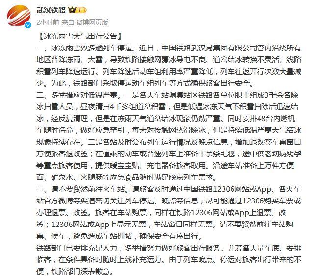 公告提到,近日,中國鐵路武漢局集團有限公司管內(nèi)沿線所有地區(qū)普降凍雨、大雪,導(dǎo)致鐵路接觸網(wǎng)覆冰導(dǎo)電不良、道岔結(jié)冰轉(zhuǎn)換不靈活、線路積雪列車降速運行。列車降速后動車組利用率嚴重降低,列車往返開行次數(shù)大量減少。為此,鐵路部門采取停運動車組列車等方式確保旅客出行安全。