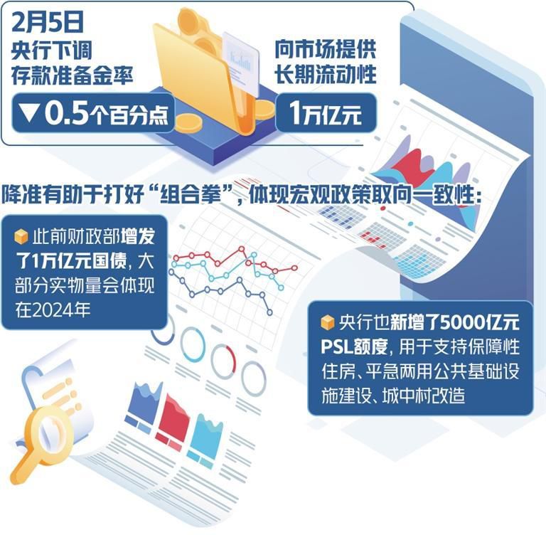 “降準有助于打好‘組合拳’,體現(xiàn)宏觀政策取向一致性?!饼嬩檫M一步表示,中央經(jīng)濟工作會議強調(diào)要增強宏觀政策取向一致性,強化政策統(tǒng)籌,確保同向發(fā)力、形成合力。此前財政部增發(fā)了1萬億元國債,大部分實物量會體現(xiàn)在2024年,央行也新增了5000億元抵押補充貸款(PSL)額度,用于支持保障性住房、平急兩用公共基礎設施建設、城中村改造,存量政策將持續(xù)體現(xiàn)經(jīng)濟帶動效應。這次降準也是宏觀政策取向一致性的體現(xiàn),有望與前期政策形成合力,進一步推動經(jīng)濟回升向好。近期,財政部還表示將繼續(xù)安排一定規(guī)模的地方政府專項債券,適當增加中央預算內(nèi)投資規(guī)模,發(fā)揮好政府投資的帶動放大效應,央行及時降準也能為后續(xù)系列穩(wěn)需求、穩(wěn)增長政策營造適宜的流動性環(huán)境。