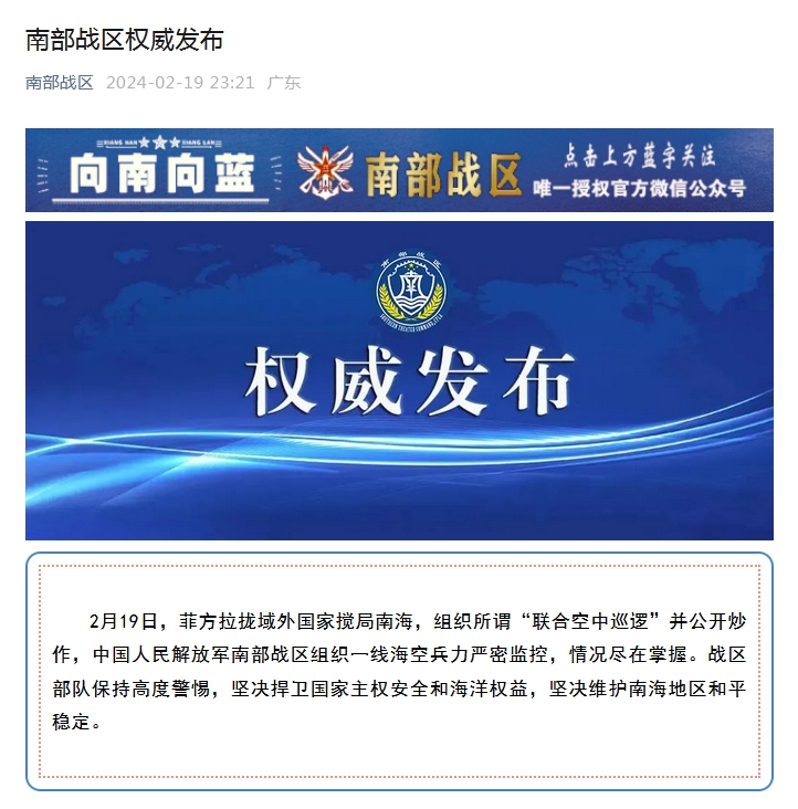 中新網(wǎng)2月19日電 據(jù)南部戰(zhàn)區(qū)微信公眾號消息,2月19日,菲方拉攏域外國家攪局南海,組織所謂“聯(lián)合空中巡邏”并公開炒作,中國人民解放軍南部戰(zhàn)區(qū)組織一線??毡烂鼙O(jiān)控,情況盡在掌握。戰(zhàn)區(qū)部隊保持高度警惕,堅決捍衛(wèi)國家主權(quán)安全和海洋權(quán)益,堅決維護南海地區(qū)和平穩(wěn)定。