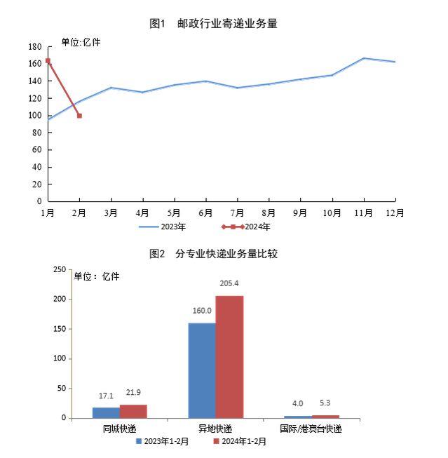 1-2月,同城快遞業(yè)務(wù)量完成21.9億件,同比增長28.3%;異地快遞業(yè)務(wù)量完成205.4億件,同比增長28.5%;國際/港澳臺(tái)快遞業(yè)務(wù)量完成5.3億件,同比增長31.9%。